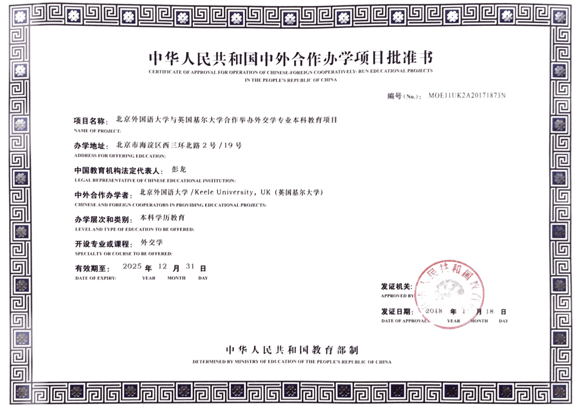 我校与英国基尔大学(Keele University, UK)共同申请的外交学本科教育项目日前已获教育部批准(编号:MOE11UK2A20171873N),计划于2018年开始招生。这是我校同英国大学的首个本科中外合作办学项目,也是国内此类合作办学性质的首个外交学专业项目。