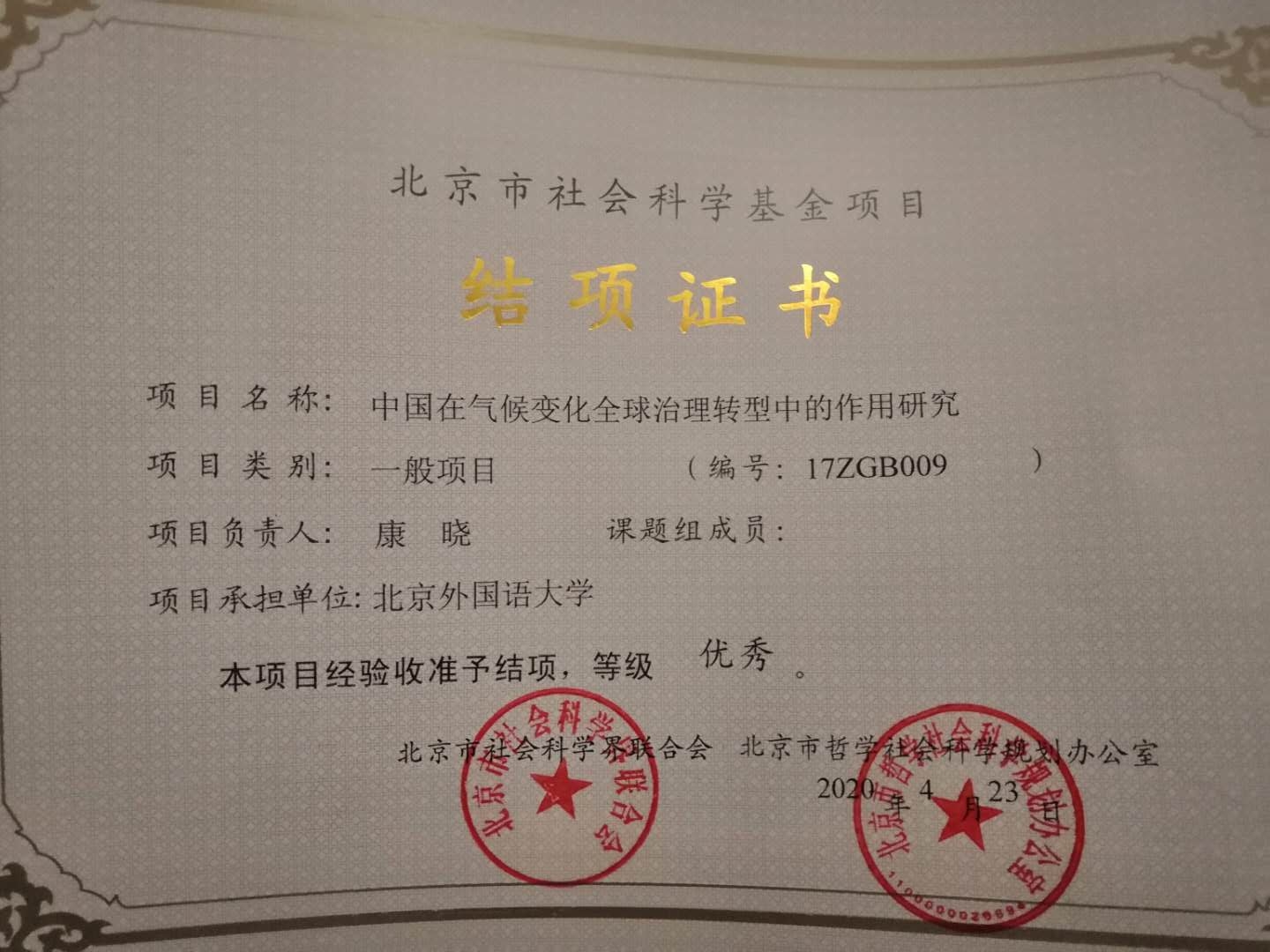 近日,pg娱乐电子游戏官网入口康晓副教授于2017年主持的北京市社科基金一般项目“中国在气候变化全球治理转型中的作用研究”(项目编号:17ZGB009)顺利提前通过结项,并获评优秀。