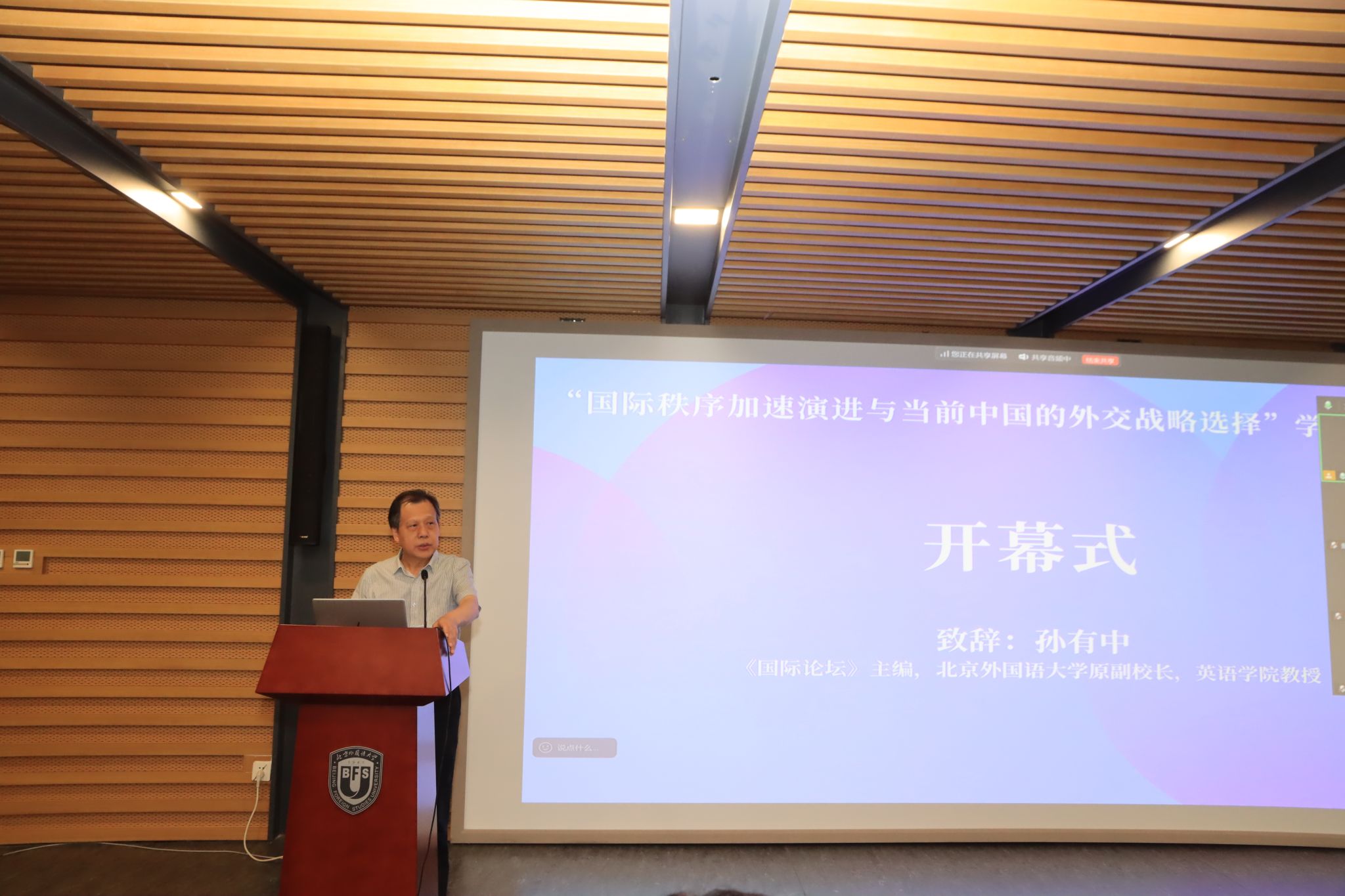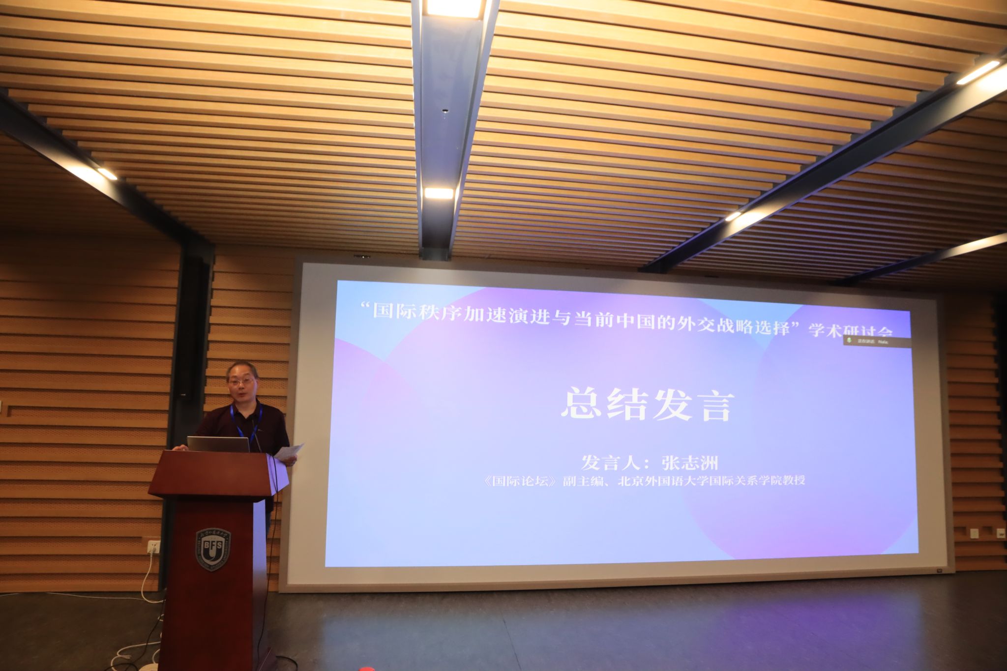会议各时段主旨发言完毕后,参会师生与专家进行了充分的讨论和交流。《国际论坛》副主编、北外pg娱乐电子游戏官网入口张志洲教授对本次研讨会做了总结。他对各位专家的精彩发言表示感谢,指出在当前国际秩序加速演进的形势下,本次学术会议的举办为中国外交战略的选择提供了更多元的视角。张志洲教授感谢与会专家对北外《国际论坛》学术期刊的支持,希望今后继续加强多渠道、多层次的学术交流。
