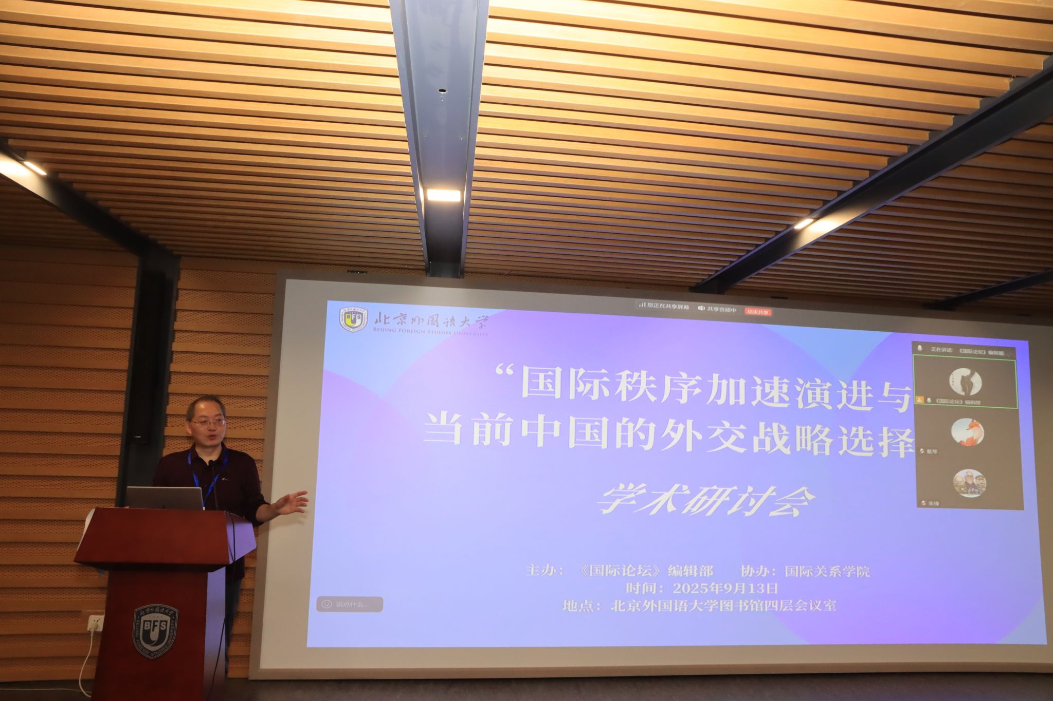 2025年9月13日,《国际论坛》编辑部在北京外国语大学图书馆四层会议室举办“国际秩序加速演进与当前中国的外交战略选择”学术研讨会。70余名师生参会,来自北京大学、清华大学、南京大学、中国人民大学、中国社会科学院、外交学院、北京外国语大学等国内高校、研究机构的12位知名专家学者做主题发言。