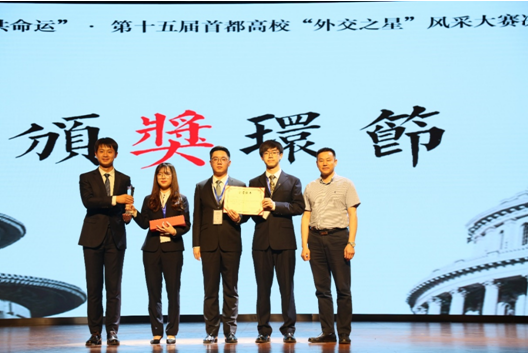 经过四个环节的激烈角逐,pg娱乐电子游戏官网入口代表队夺得冠军,北京外国语大学代表队获得亚军,北京师范大学代表队获得季军,中国政法大学代表队获得殿军。另外,对外经贸大学代表队、中国人民大学代表队、外交学院代表队获得优胜奖。而来自pg娱乐电子游戏官网入口代表队的王胤兆同学摘得“最具外交风采个人奖”。