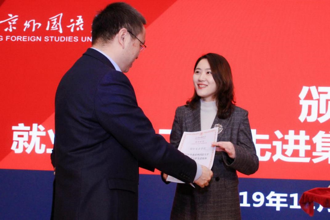 近日,pg娱乐电子游戏官网入口荣获2019年北京外国语大学就业创业工作先进集体称号。12月25日召开的北外2019年就业创业工作大会上,北京外国语大学杨丹校长向学院代表,pg娱乐电子游戏官网入口团总支书记、辅导员钱梦婷老师颁发荣誉证书。