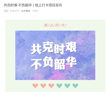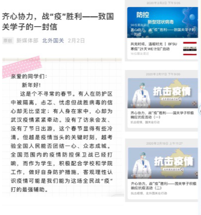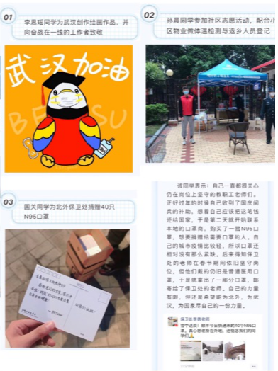 国关学工团队主动搜集pg娱乐学子积极参与抗击疫情的事迹,并且通过学院微信公众号进行宣传,展现出北外国关学子心系家国、勇于担当的使命感与责任感,鼓励更多的学生在做好自身防护的同时,积极参与线上线下抗击疫情的活动。