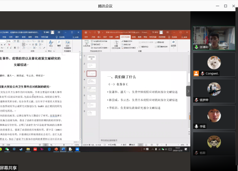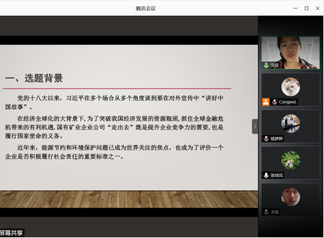 会议伊始,张效民老师首先高度评价了学生参加大创项目的积极性,大学生创新创业训练计划项目在培养学生的实践和创新能力方面发挥着积极的作用,因此鼓励更多的同学参与项目研究。在答辩过程中,陈述人分别向点评老师阐述自己团队的项目概况,取得了点评老师的肯定,也收获了相应的建议。其中,第一组陈述人吴俣围绕中国国有企业“走出去”过程中环境保护问题频发的原因展开讨论,选题的现实意义得到了评委老师的肯定,同时老师也指出题目聚焦不够、样本数量不足等问题;接下来针对基层社区突发公共卫生事件的应急能力项目研究小组对其项目进行阐述,项目较为重要的现实意义、团队踏实的研究态度得到了杨毅老师、李猛老师的肯定,同时,老师们也针对该项目提出了缩小研究范围的建议;张谦和同学就中日政府应对突发公共卫生事件的机制展开项目介绍,项目具有研究意义,也收获了李猛老师提出的更改研究模型的意见;黄文同学对团队项目的创新点、进展等概况进行阐述,基于新制度主义的视角展开对“学生权益部”的研究,项目设计新颖,但主题切入点仍可完善;陈雨桐从北外与英国基尔大学的比较出发,研究国际组织人才培养与输送问题,研究工作规范,得到肯定;李雨涵同学从“北外书屋”的支教旅游乡村振兴计划获取研究灵感,展开项目阐述,得到钱梦婷老师对项目名称和实际实践内容需保持一致性的建议,以及李猛老师对提高项目可复制性的意见。在答辩过程中,同学们充分展现了国关学子的专业研究精神,收获了老师们有益的建议,会议进展十分顺利。