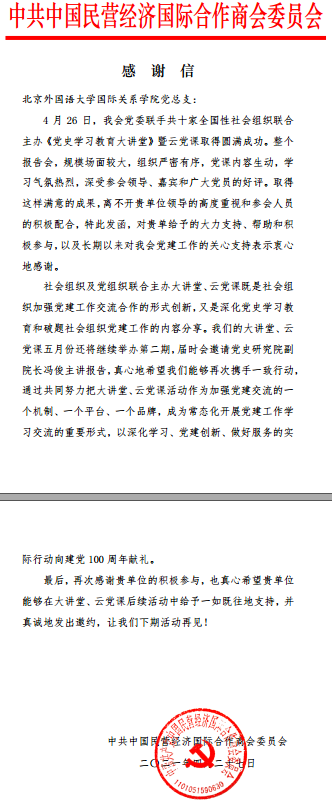 为持续深入开展党史学习教育,4月26日下午,pg娱乐电子游戏官网入口学生党支部组织学生党员参加了由中国民营经济国际合作商会等十家社团联合举办的《党史学习教育大讲堂》暨云党课系列活动首场党课,聆听了中共中央对外联络部原副部长于洪君同志作了关于“世界政党挌局的嬗变与中国共产党对外交往”的报告。活动中,pg娱乐电子游戏官网入口党员同学表现出较高的专业和政治素养,得到了主办方的赞许。为此,中共中国民营经济国际合作商会委员会特向pg娱乐电子游戏官网入口党总支发来感谢信,感谢信原文如下: