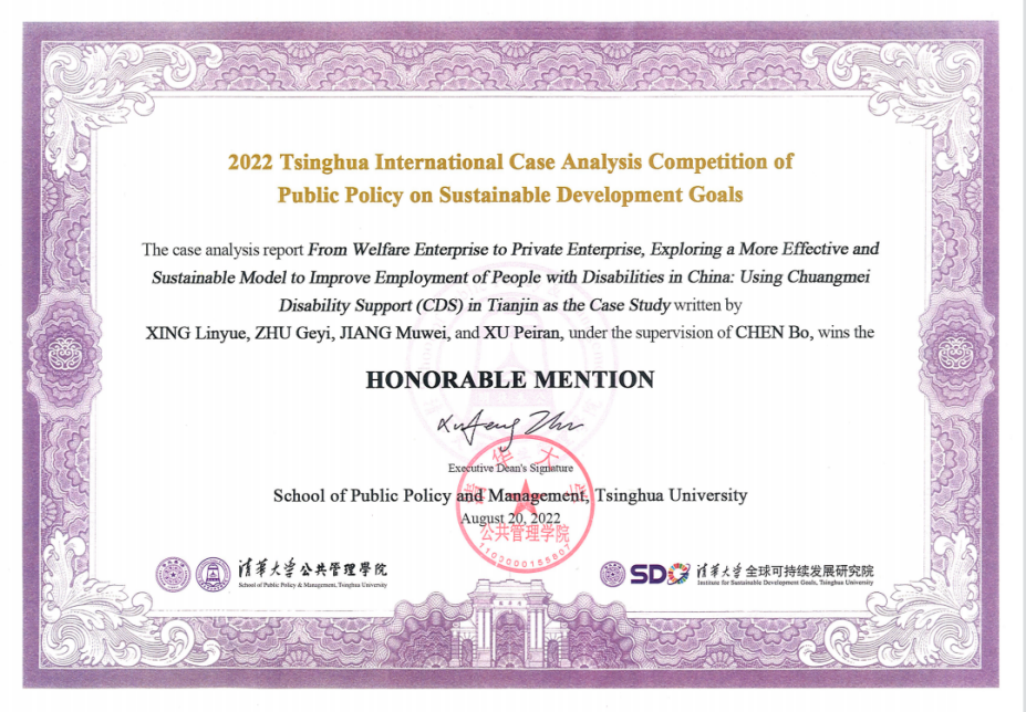 pg娱乐学生聚焦“从福利企业到私营企业,探索更加有效和可持续的模式促进残疾人就业:以创美模式为例”(From welfare enterprise to private enterprise, exploring a more effective and sustainable model to improve employment of people with disabilities in China: using Chuangmei Disability Support (CDS) in Tianjin as the case study),通过探访天津创美助残基地,了解我国目前最新的推动残疾人就业模式,在陈波老师的指导下,从残疾人就业现状、就业政策变迁调整、企业助残困境、创美助残模式等角度进行案例研究,并提供建议。