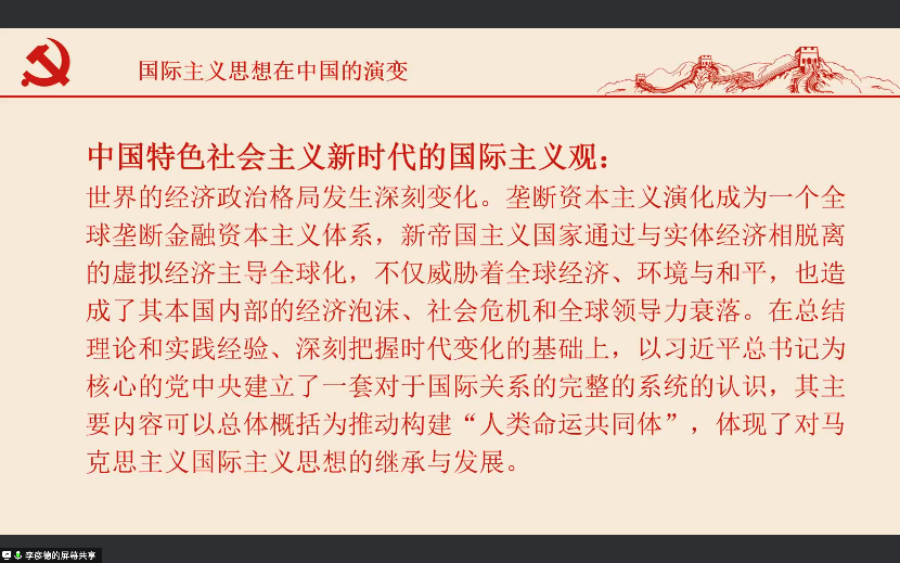 其次,关于人类命运共同体主题,李彦德同志从国际主义角度分析了人类命运共同体思想的内涵,包括正确义利观,区域命运共同体和新型全球治理观,提出新时代中国特色社会主义的国际主义观是对马克思主义国际主义思想的继承与发展。聂晓旭同志则是从共同抗疫角度分析了人类命运共同体对于全球卫生安全发展的重要性,尤其是在后疫情时代下如何弘扬全人类共同价值的问题。此外,胡宇杰同志结合天下大同思想,分享了自己对于人类命运共同体理念的理解,认为其为优秀中国传统文化的外延和时代性创新,将“和而不同”理念拓展到了追求人类共同价值高度。