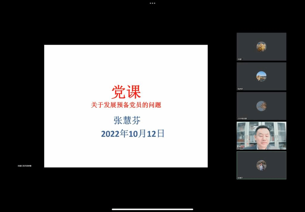 2022年10月12日下午三时,pg娱乐电子游戏官网入口党总支举办线上专题党课。本次党课由pg娱乐电子游戏官网入口党总支书记张效民老师主持,由北京外国语大学张慧芬老师主讲,pg娱乐电子游戏官网入口本科生党支部书记、辅导员钱梦婷老师以及pg娱乐电子游戏官网入口全体党员、预备党员、发展对象、入党积极分子以及有意愿申请入党的同学参加会议。