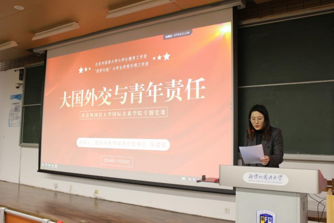 活动伊始,钱梦婷老师介绍了本次专题党课开展的背景和主要内容。她谈到当今世界处于百年未有之大变局,人类面临着诸多挑战,国际社会对大国责任的要求空前强烈。在这样的时代背景下,中国青年被赋予了不可替代的责任,作为北外pg娱乐电子游戏官网入口的学子,应勇立时代潮头,找准自身定位,将自身的理想抱负与国家各项事业的发展紧密联系起来,为中国和世界的美好未来贡献自己的一份青春力量。