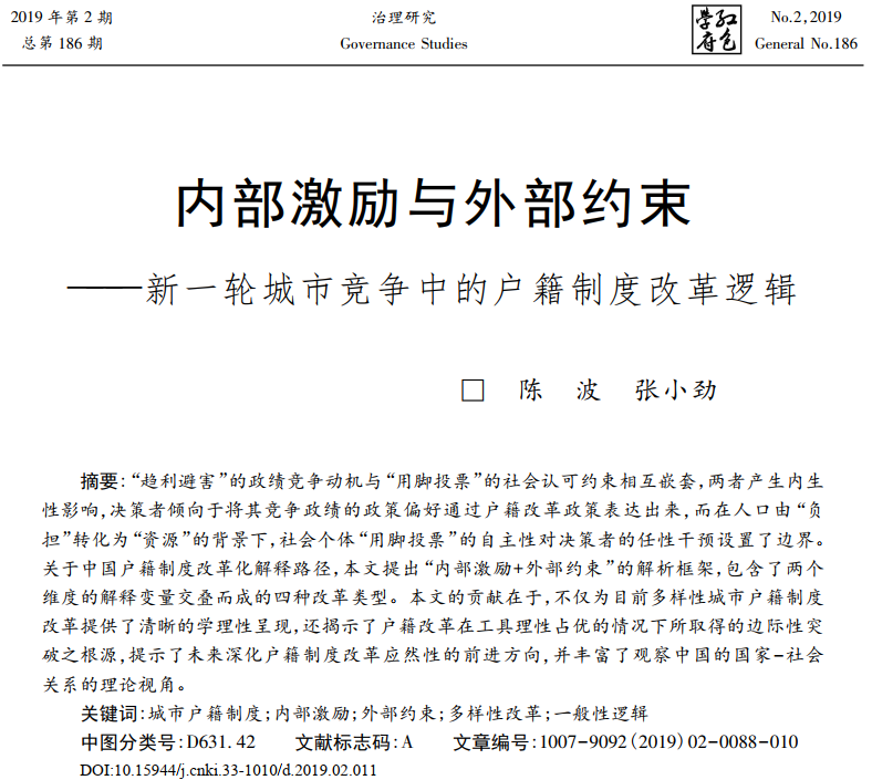pg娱乐电子游戏官网入口教师陈波以第一作者在CSSCI期刊《治理研究》发表论文:《内部激励与外部约束——新一轮城市竞争中的户籍制度改革逻辑》,论文摘要和原文链接如下: