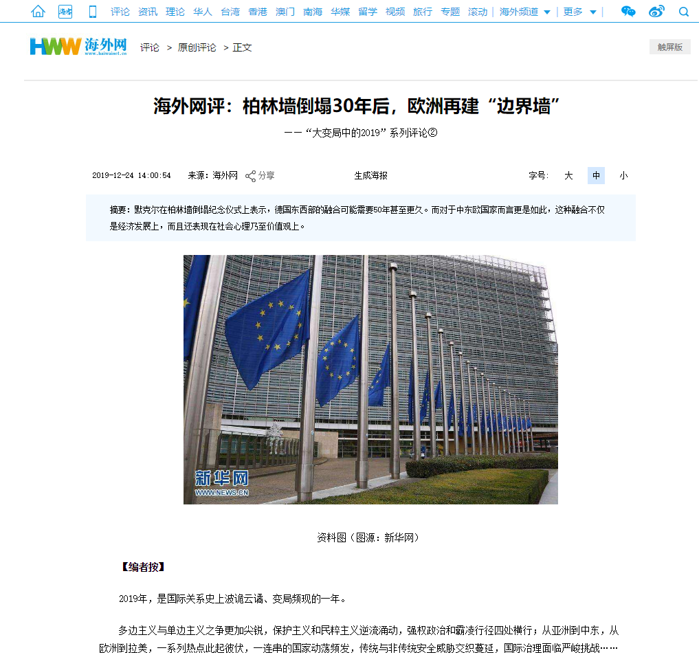 pg娱乐电子游戏官网入口王明进副院长作为海外网特约评论员发表文章,题目是《柏林墙倒塌30年后,欧洲再建“边界墙”》。该文是海外网推出的年终系列国际评论,“回望‘大变局中的2019’”的第2篇。海外网致力于打造中国在海内外具有重要影响力的新媒体国际传播平台,第一时间向读者提供中国热点、国际时政,特别是涉华国际新闻事件的权威解读。以下是文章题头截图、摘要和文章原文地址。