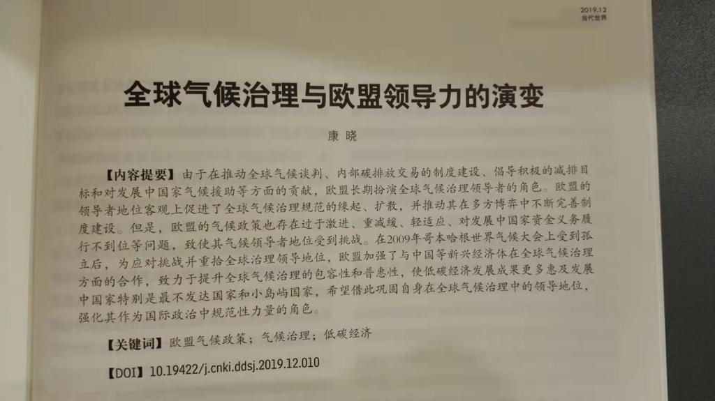 pg娱乐电子游戏官网入口康晓副教授在CSSCI期刊《当代世界》2019年第12期发表论文《全球气候治理与欧盟领导力的演变》,以下是论文摘要: