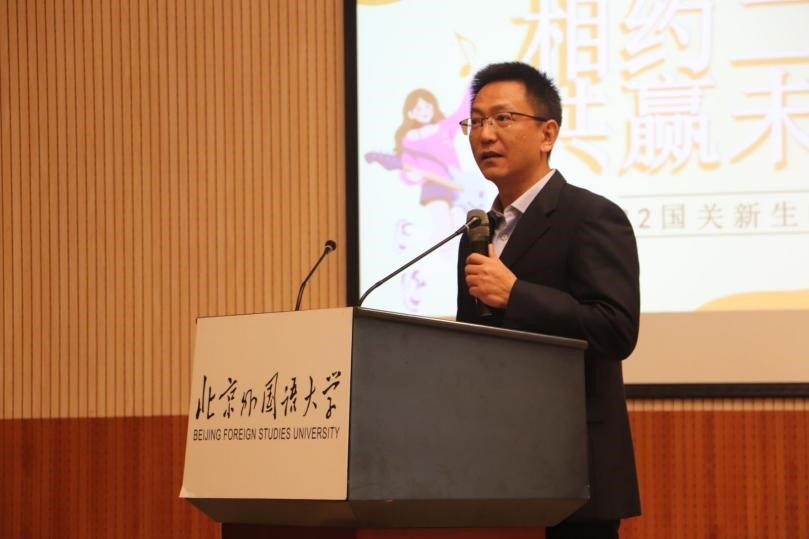 首先,谢韬院长上台致辞,谢院长向新生同学们表达了亲切关怀,同时向Richard老师和所有留学生同学致以问候,他表示,无论经历苦与乐,最终我们都会爱上北外,爱上国关。