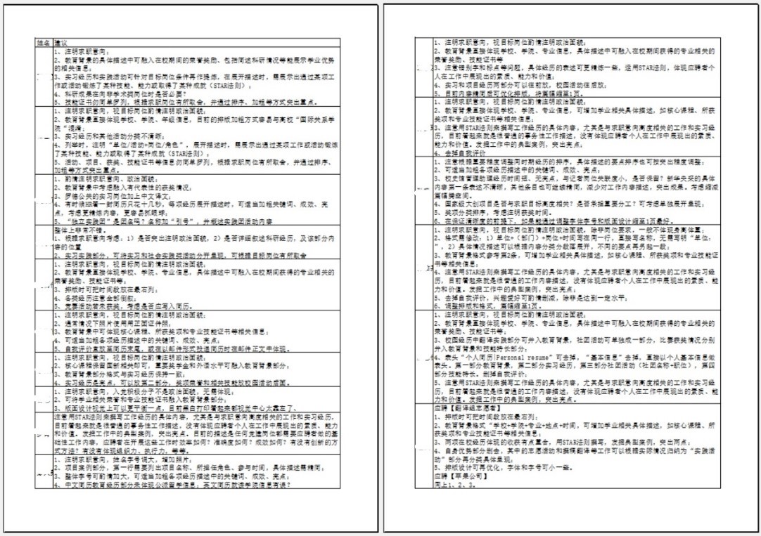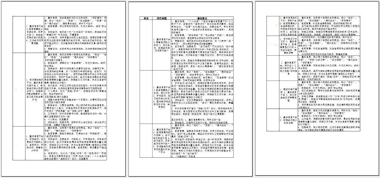 本期活动中,同学们的专业背景更加多元化,简历内容也更加丰满。老师们肯定同学们简历中的亮点,也发现了一些普遍性的问题,如:求职意向未能明确标注、板块划分不够明确、教育背景等信息未能按照时间顺序排列、关键词不够突出、经历和技能介绍缺乏与求职意向的关联性等等。希望同学们认真地参考老师们的修改意见,让简历更专业、更亮眼,助力同学们拿到心仪的offer