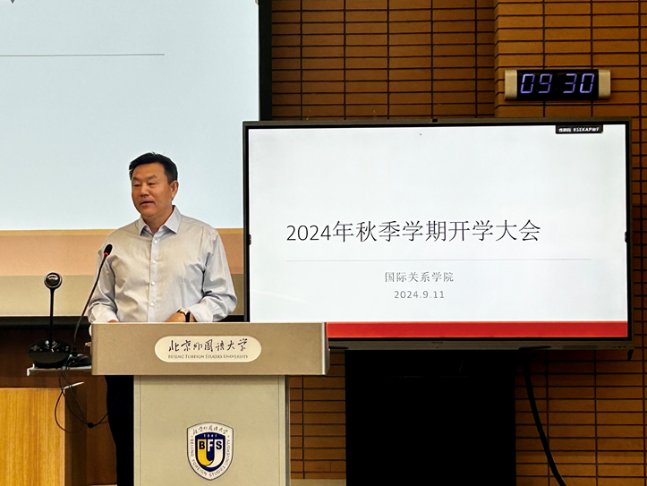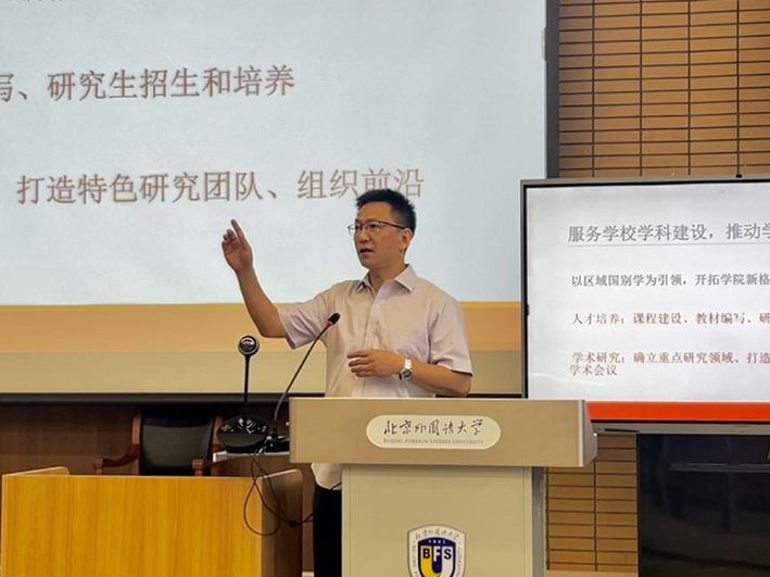 谢韬院长从学校、学院的高质量发展对学院新学期工作进行部署,提出新学期要把握学校新增四个博士学位授予点的战略机遇,推动学校整体学科矩阵高质量发展;学院要以区域国别学为引领,深化人才培养、学术研究;同时根据学校本科教育教学审核评估整改方案,着力完善本科教学质量保障体系与学生职业生涯规划和指导体系,积极探索和国外名校的联合培养与交流合作模式,推动学院教育国际化发展,鼓励本科生多参与教师组织的科研工作,提升学生科研能力,加速学科和科研资源转化为教育教学资源。