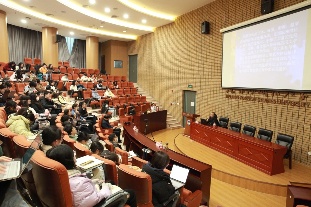 2023年12月13日下午,yl23455永利集团yl23455永利集团举办“北外文华讲堂”系列讲座,邀请国家级教学名师、国家万人计划教学名师、中国韵文学会会长、中国宋代文学学会副会长、浙江省特级专家、浙江工业大学人文学院肖瑞峰教授作题为《白居易与日本汉诗——经典传播与接受的一个案例》的学术报告。讲座由中文学院院长詹福瑞教授主持,副院长方稚松教授及师生数十人参加此次讲座。