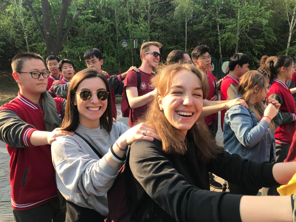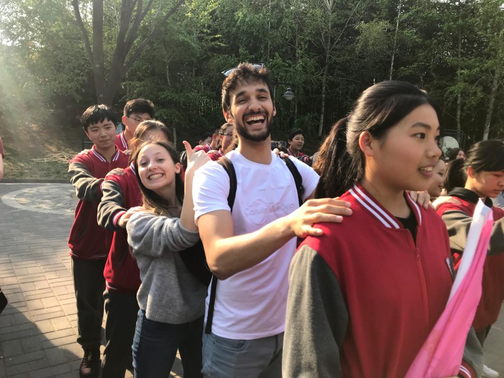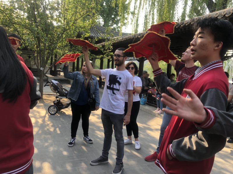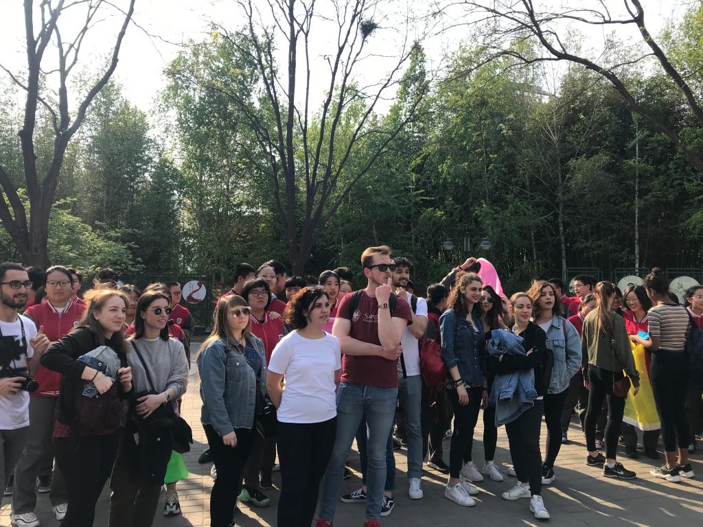 2019年4月15日星期一下午,yl23455永利集团中文学院对外汉语系2018级意大利罗马班的全体留学生与北外附中初三、高一年级学生共同参加了在紫竹院公园举办的“青春飞扬,舞动春日” “1+3”年级趣味运动会。
