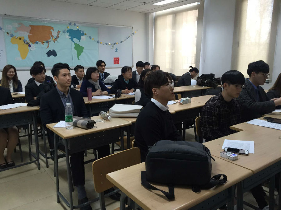 2017年12月5日中文学院对外汉语系14-3班举行毕业实习报告会,车志贤和金仁求担任报告会的主持人。14-3班17名同学曾在2017年11月13日-17日,在对外汉语系主任朱勇老师的带领下远赴江苏南京、无锡和上海毕业实习,参观考察了南京可口可乐公司、无锡江阴海澜之家公司、上海太太乐公司和上海大众汽车集团等企业。此次报告会上,14-3班的5组学生分别围绕上海大众、海澜之家、可口可乐及南京路和夫子庙商业街对比等主题做了精彩的报告,赢得了三位评委老师的一致好评。