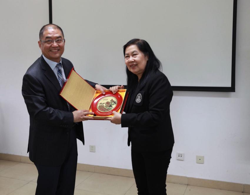 会议先由留学生办公室姜颖老师代表北外致辞。姜老师主要介绍了北外在国际合作方面的成就和特色,接着由中文学院魏崇新院长代表学院致辞。魏院长从中文学院的主要特色、部门构成、各部门职能进行介绍,指出中文学院是国内少有的中外学生同院同堂学习的教学单位,为中国文化和国际文化的融合与传播提供了十分有利的条件。接着对外汉语系主任朱勇老师、汉语培训中心主任刘继红老师、汉语培训中心副主任岳岚老师分别从各系部学生培养理念、课程设置、教学特色等方面进行了说明。之后由泰国艺术大学教育学院马良院长致辞。她主要介绍了教育学院的汉语师资培养情况,指出当地教师对中国国粹京剧、传统中国厨艺以及中国书法都有着浓厚的兴趣,希望加强两院各方面的合作。双方就初步合作项目进行了交流,包括短期进修生交换、文化交流、汉语师资培训等项目。最后两院院长互赠礼品,全体与会人员合影留念。