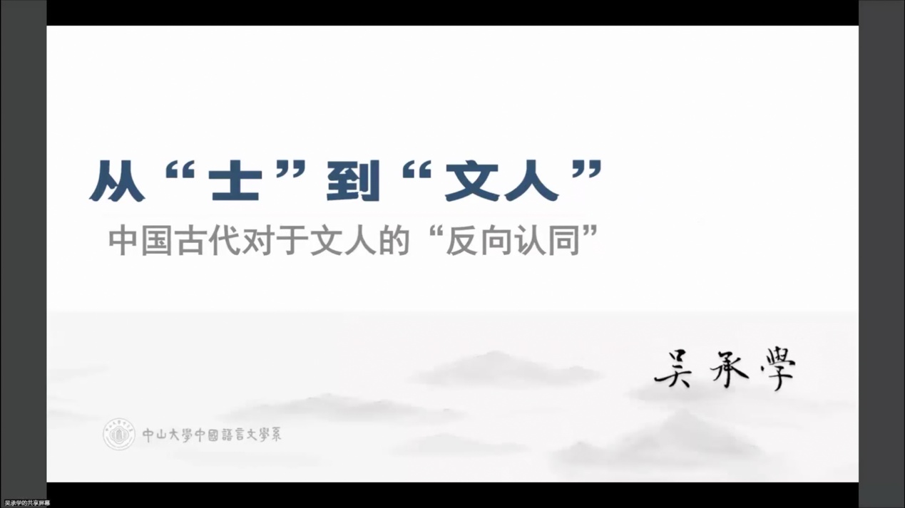 2022年12月7日下午,中山大学中文系教授、博士生导师、中山大学“逸仙学者”讲座教授、教育部“长江学者特聘教授”吴承学先生应邀做客“北外文华讲堂”,以线上方式作了题为《从“士”到“文人”——中国古代对于文人的“反向认同”》的报告。报告由北外yl23455永利集团学术委员会主任魏崇新主持,yl23455永利集团院长詹福瑞、副院长方稚松以及学院师生共一百余人参与。