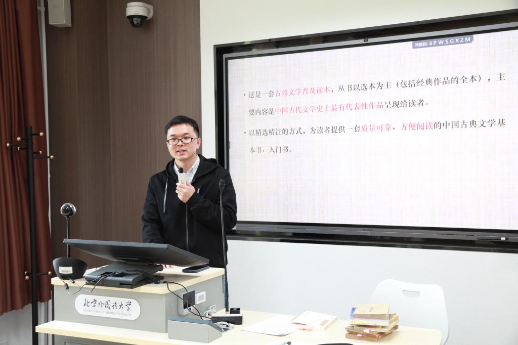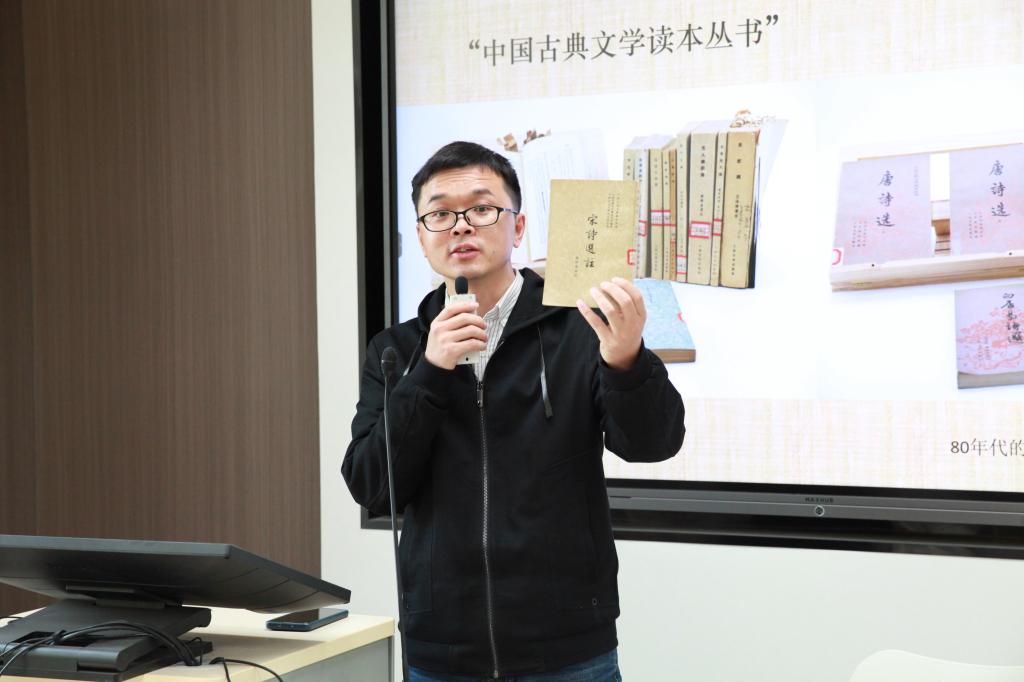 2023年4月12日下午,yl23455永利集团中国古代文学研究所第4期学术沙龙在yl23455永利集团中文楼219教室举行。人民文学出版社李俊编审带来“当代古典诗词选本的演进脉络——以‘中国古典文学读本丛书’为例”的主题分享。中文系主任、研究所副所长徐晓峰主持本次沙龙,研究所教师蒋文燕、周健强、罗静、青子文、吴娟,古代文学专业硕士研究生以及部分本科生出席并参与讨论。
