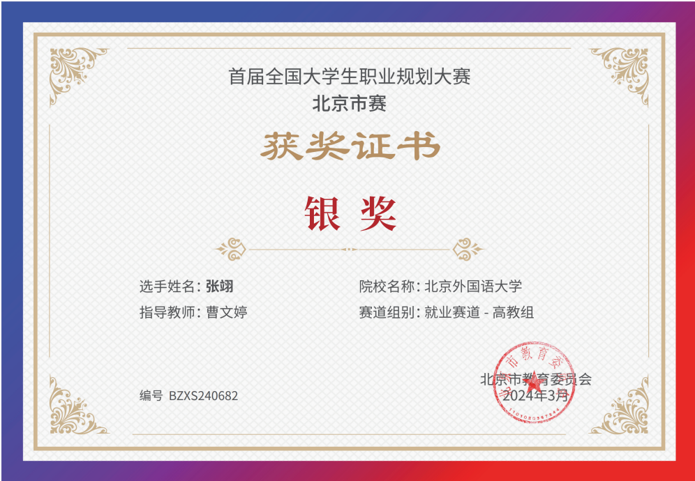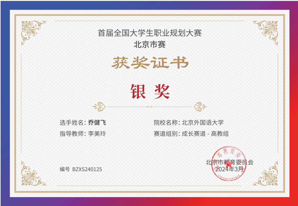 为贯彻落实党中央、国务院关于高校毕业生就业工作的决策部署,加强高校生涯教育和就业指导,促进高校毕业生高质量充分就业,教育部举办首届“筑梦志在四方·规划启航职引未来”全国大学生职业规划大赛。yl官网同学积极响应、踊跃参与,并在校内选拔赛中脱颖而出,晋级北京市赛。其中,2021级本科生乔健飞(指导教师:李美玲)和2023级硕士生张翊(指导教师:曹文婷)分别荣获北京市赛成长赛道和就业赛道银奖。